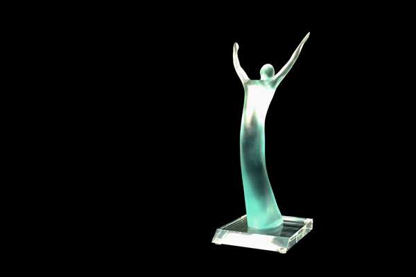 From Komuro’s clay prototype, the manufacturing of the Ovation statues has fallen to one man — artist Philip Hitchcock. Hitchcock worked with Freimuth to refine Komuro’s mock-up, considering various materials such as black Lucite and marble and color schemes including reddish-amber. Eventually they settled on resin in the current shade of light aqua, which provided an optical, transparent feel.
